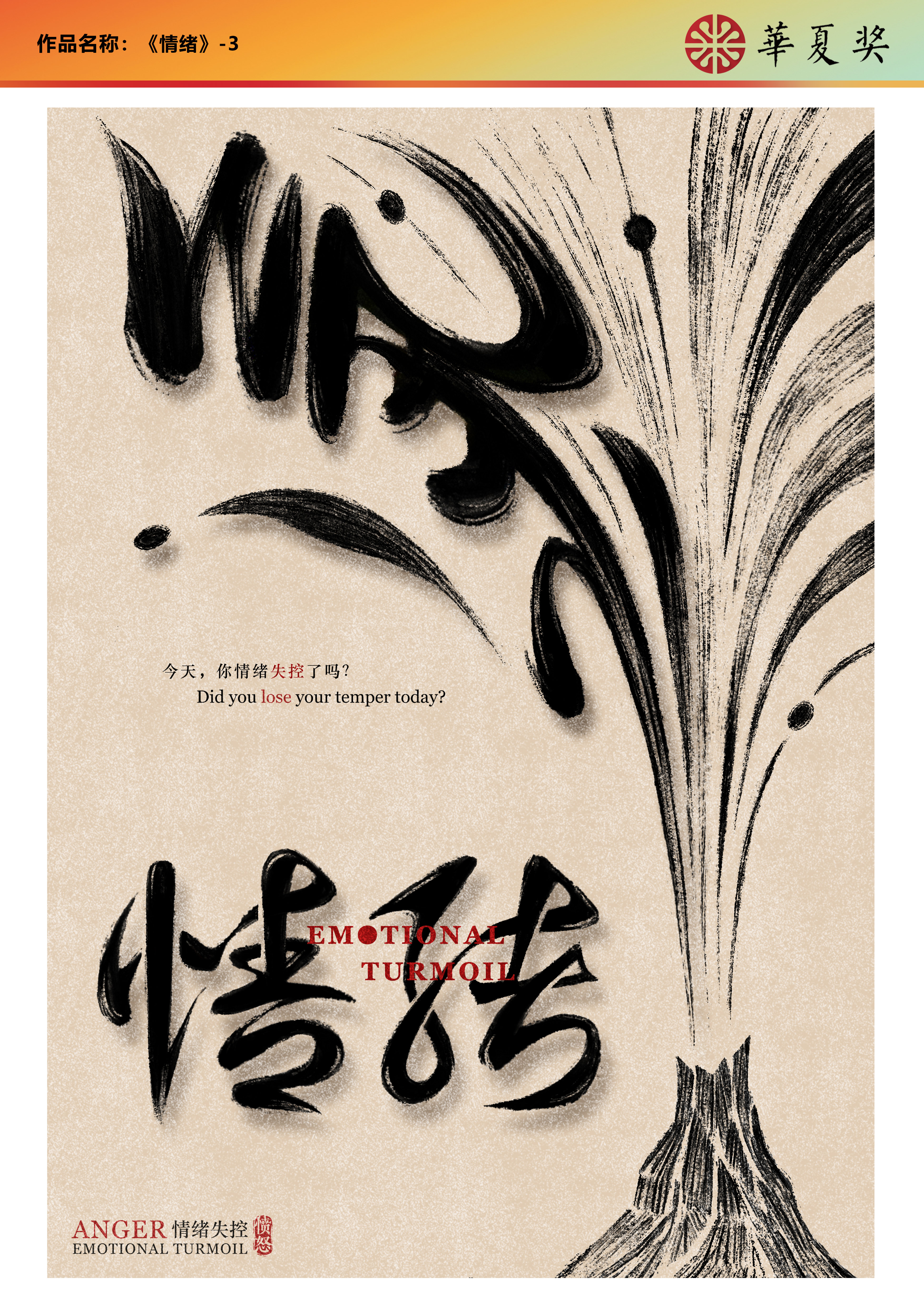 该组海报以失控情绪为主题进行设计,针对“愤怒”这一具体情绪状态,将狂放的草书“怒”、“气”二字分别与图形进行同构,在文本含义与图像视觉上共同构成情绪失控的混乱与冲动;海报中“情绪”二字大小的变化则强调了情绪起伏不定的特点。