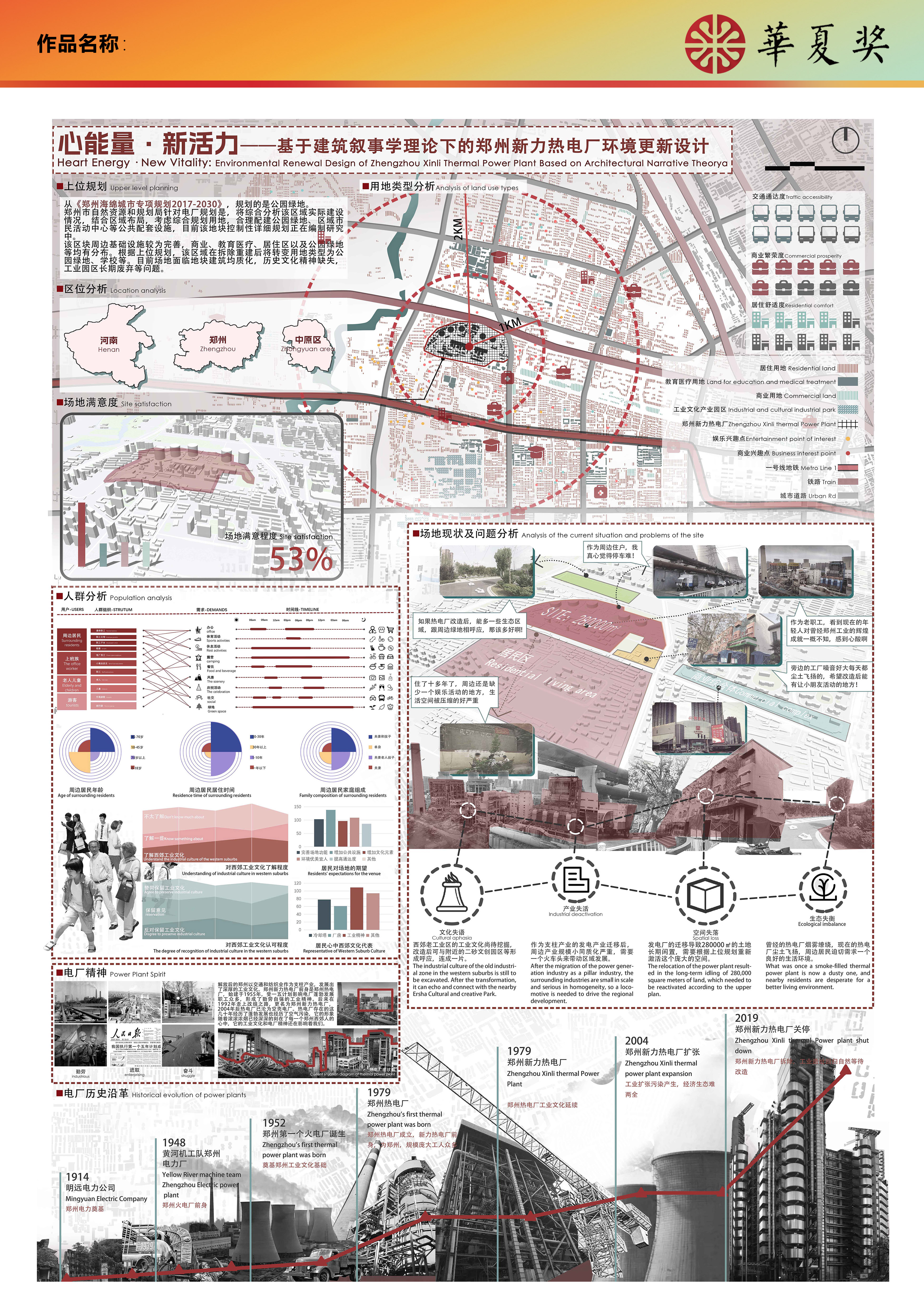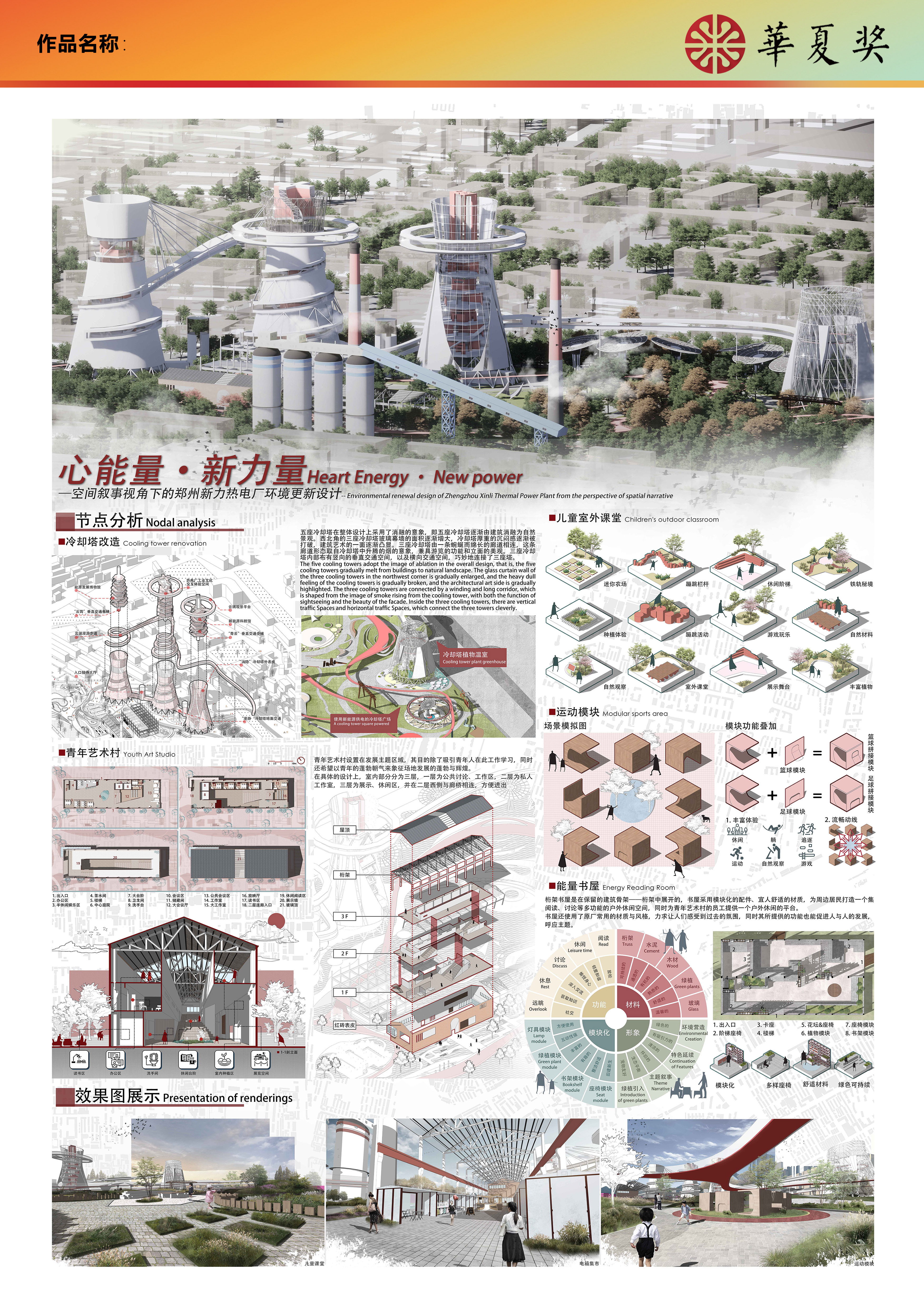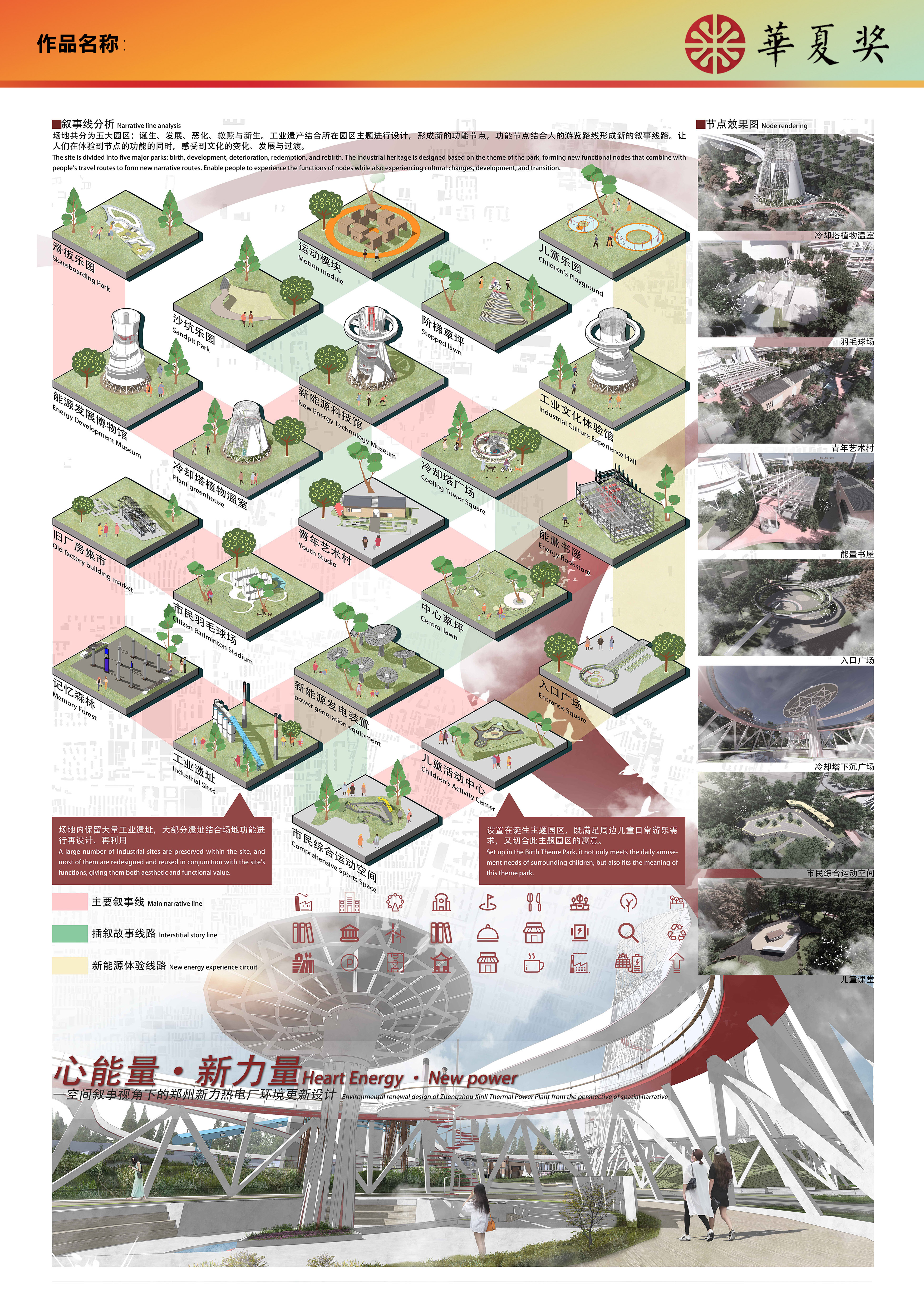 本次设计的选址是位于郑州市中原区的郑州新力热电厂。针对目前场地所面临的文化失语、空间失落、产业失活、功能单一等问题,我们将已经废弃的工业生产空间转移,重新置入公共空间动空间、展览空间等,根据场地的工业文化气质,重新打造具有文化记忆和公共属性的城市公园,并以”能量“作为主题和出发点展开设计。设计通过空间的形式叙述出能量在生活中存在的痕迹,传达同心齐力合理利用能量会使我们生活更美好的可持续设计理念。