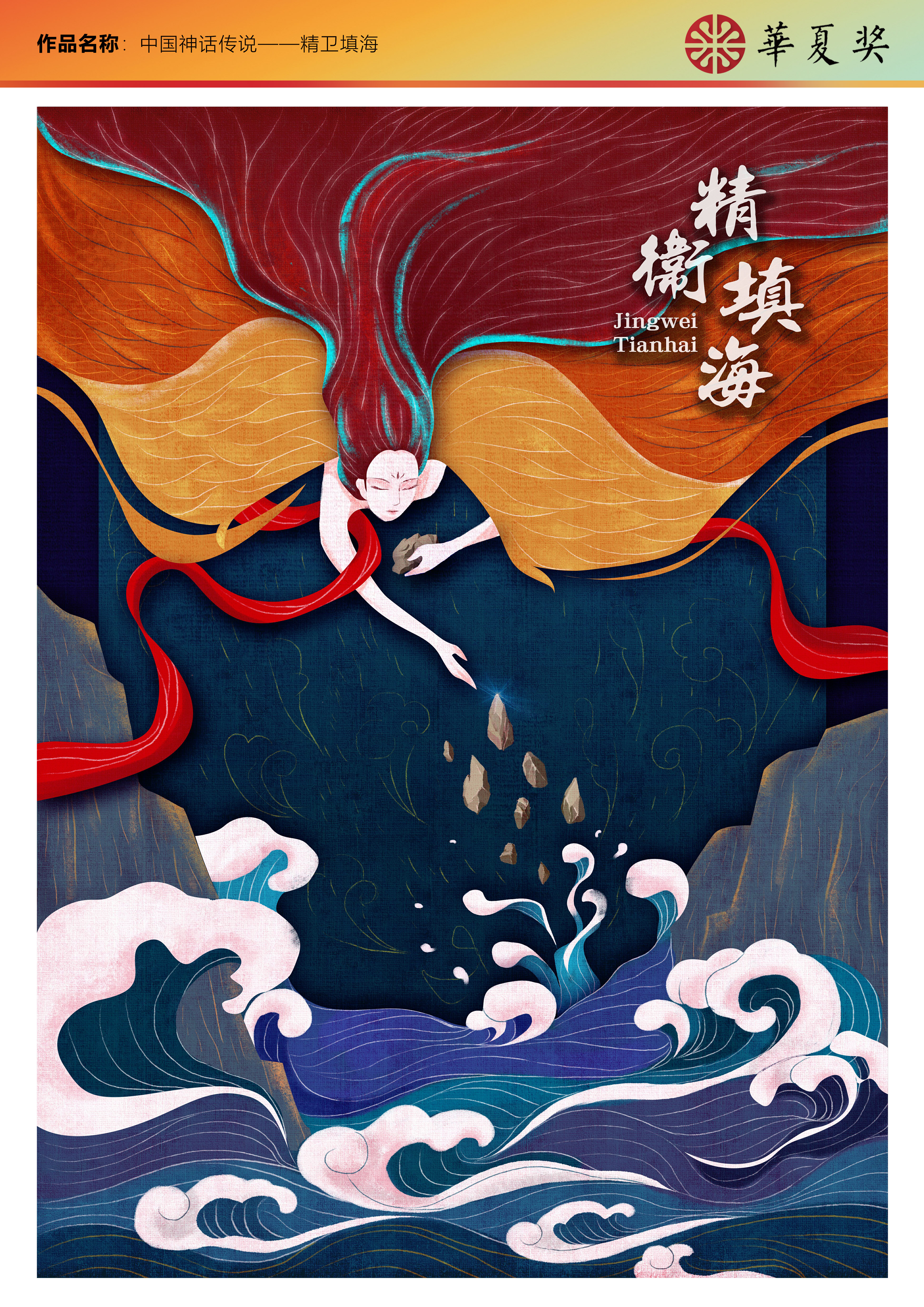 中华文化博大精深,神话故事更是其中的璀璨瑰宝,其不仅体现了古代劳动人民天马行空的浪漫想象,更展示出他们勤劳勇敢的美好品质。 本系列作品选取了后羿射日、女娲补天、精卫填海三个中国传统神话故事进行艺术创作,采用国风画法进行表达,希望可以表现出泱泱华夏悠久的历史底蕴以及灿烂的文化瑰宝。