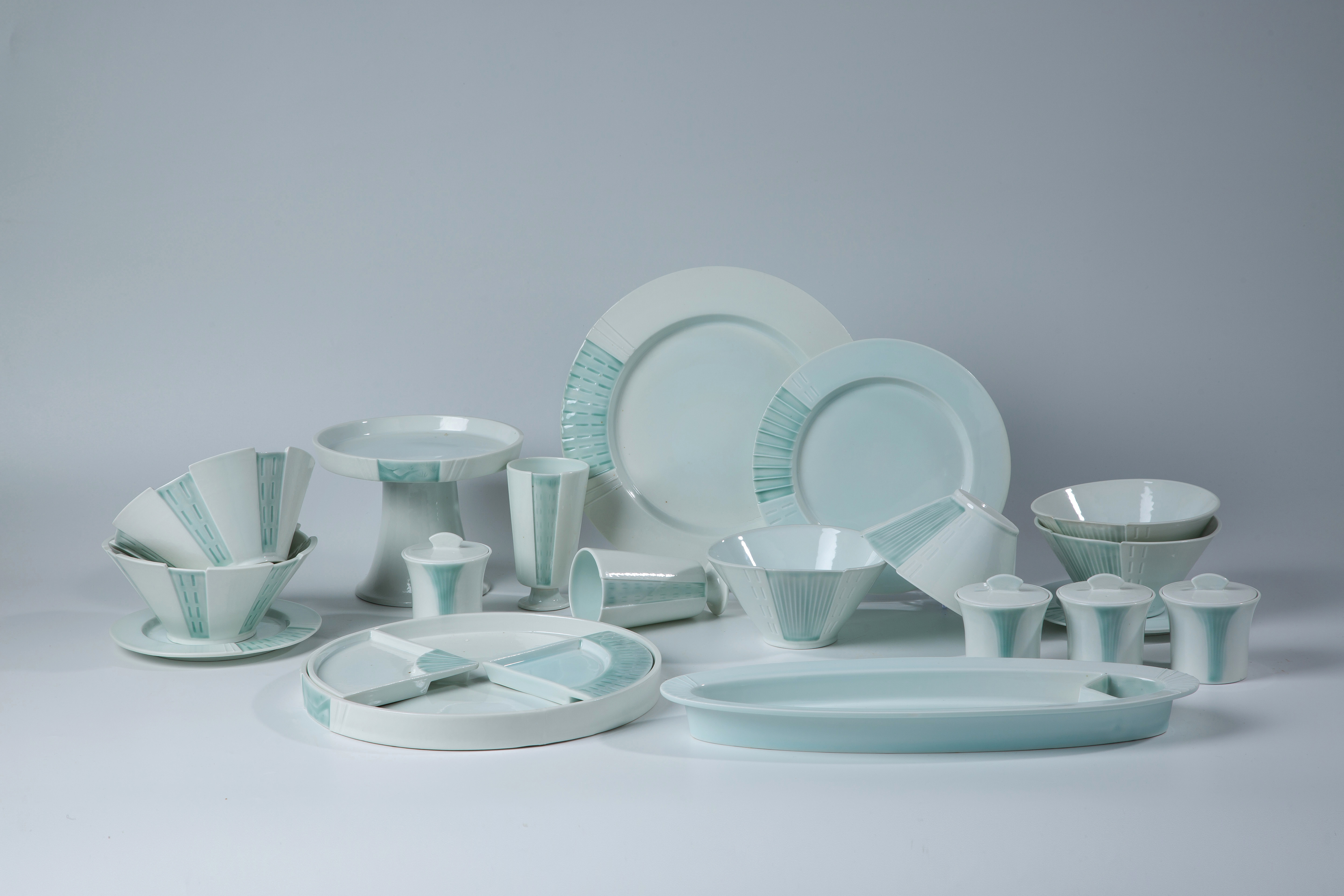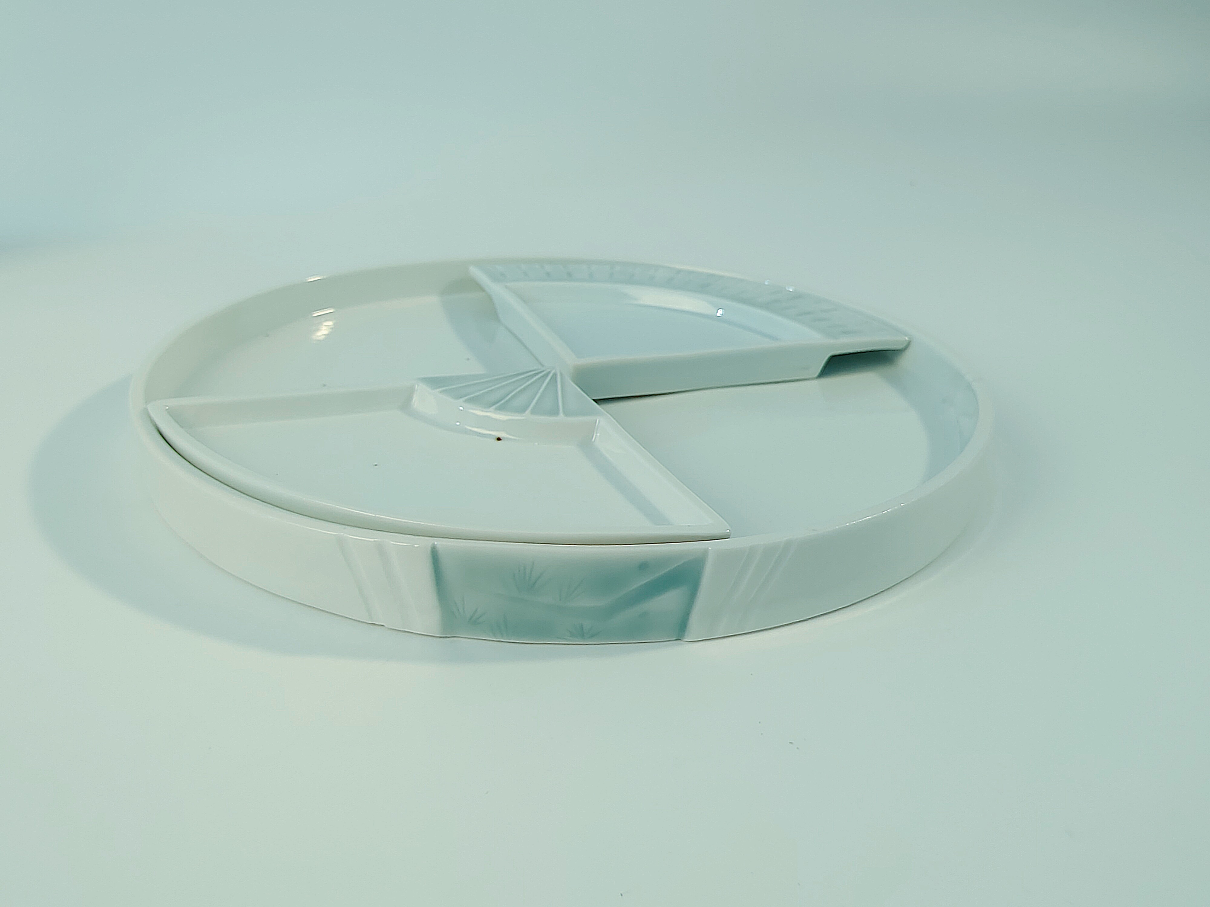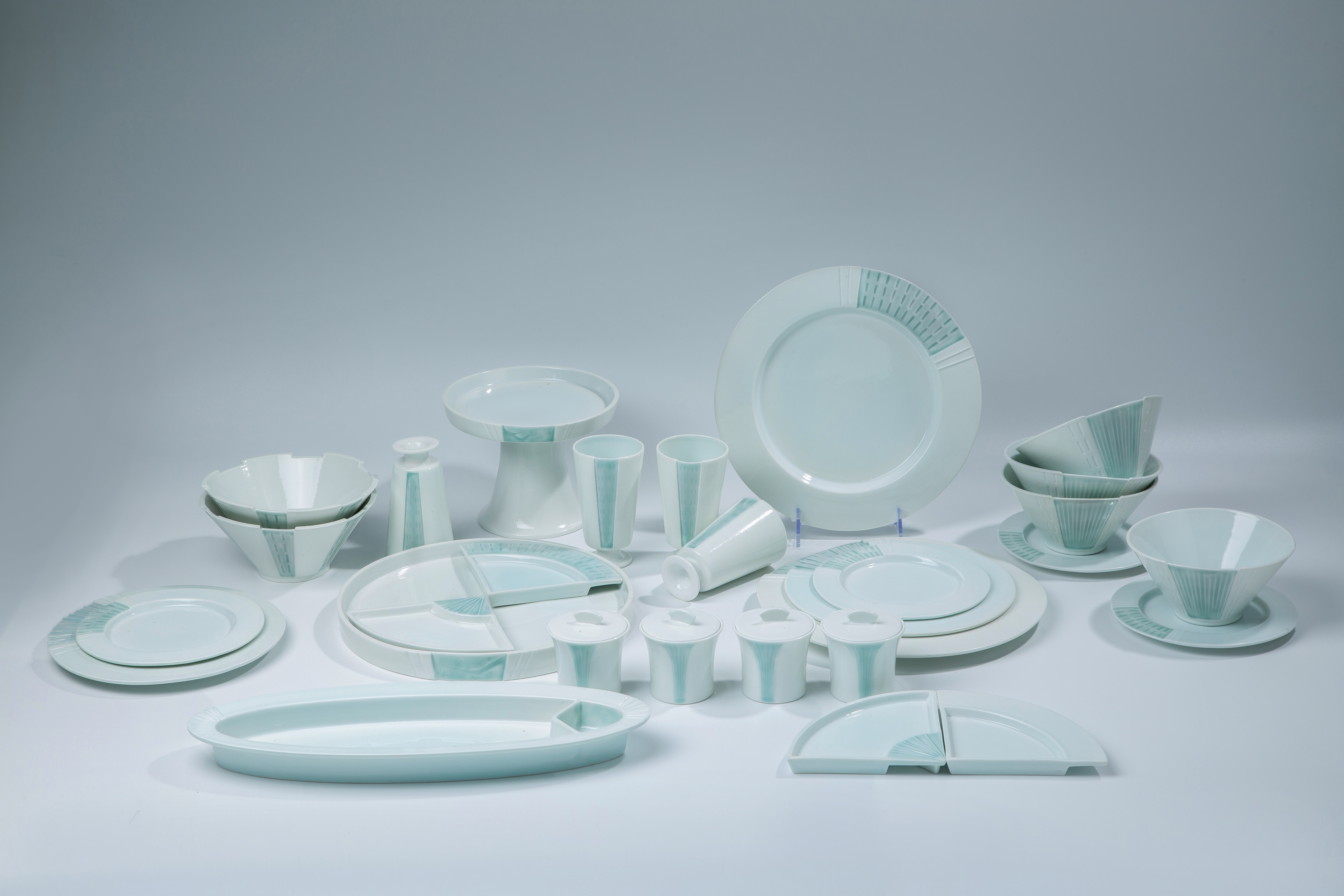 作品以松为主要造型,将松与青白瓷的釉色、装饰技法相结合,采用了阴刻阳刻等多种装饰技法。同时在合适位置搭配进行彩绘,以产生丰富的视觉要素,实现了设计的审美效果,也营造出了典雅、恬静的中式用餐美学。