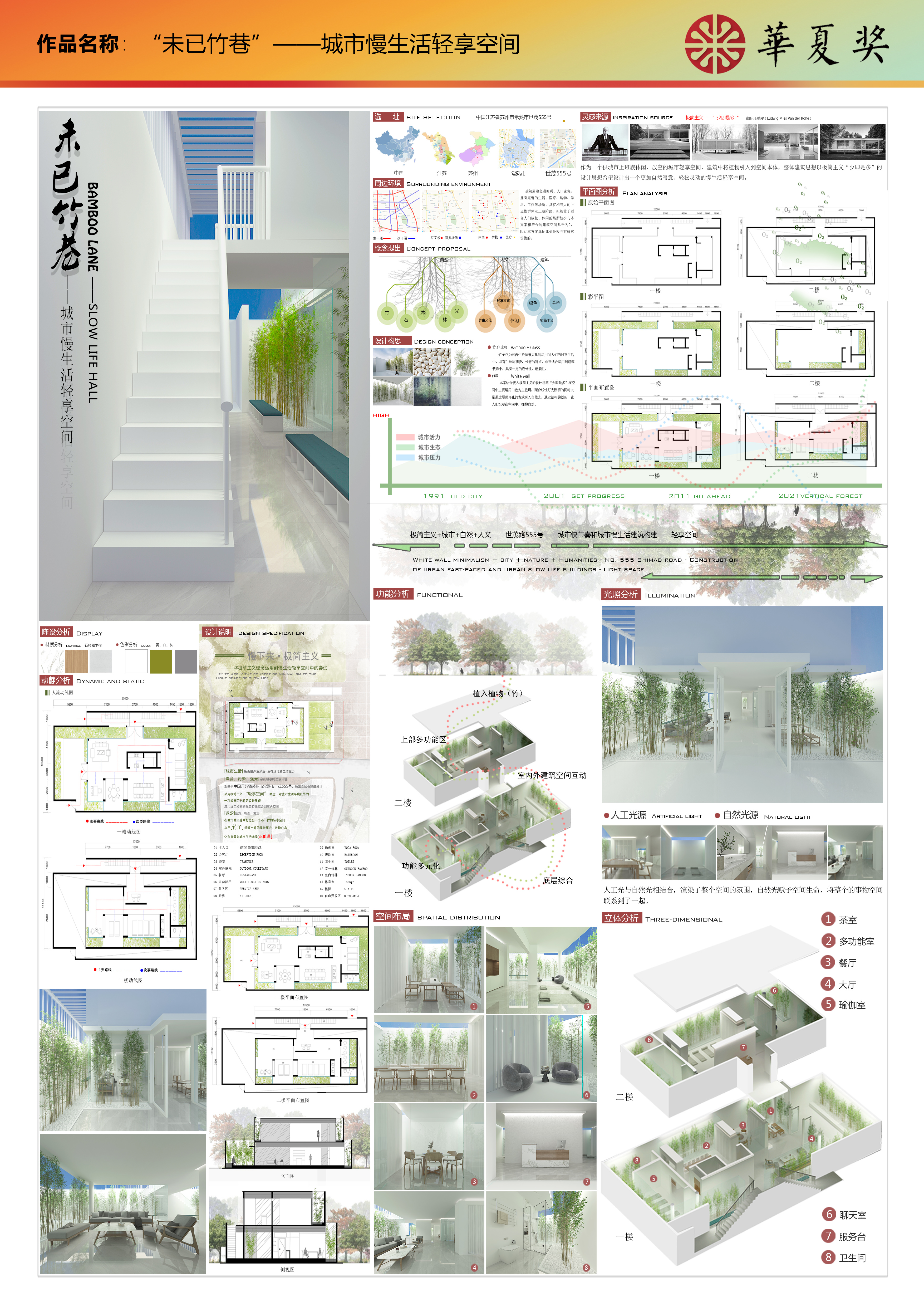 作品简介:城市生活所面临严重矛盾,生存环境和工作压力;噪音、污染、强光、粗暴的生活环境,现基于中国江苏省苏州市常熟市世茂555号,做出尝试性建筑设计;采用极简主义“轻享空间”概念,对城市生活环境以外的一种 轻享受空间的设计展现;应用绿色植物的生态特性结合到室内空间;减少压力、嘈杂、繁琐,在城市的夹缝中打 造出一个不一样的轻享空间;应用竹子缓解空间的视觉压力、放松心态.化负能量为城市生活增添正能量。