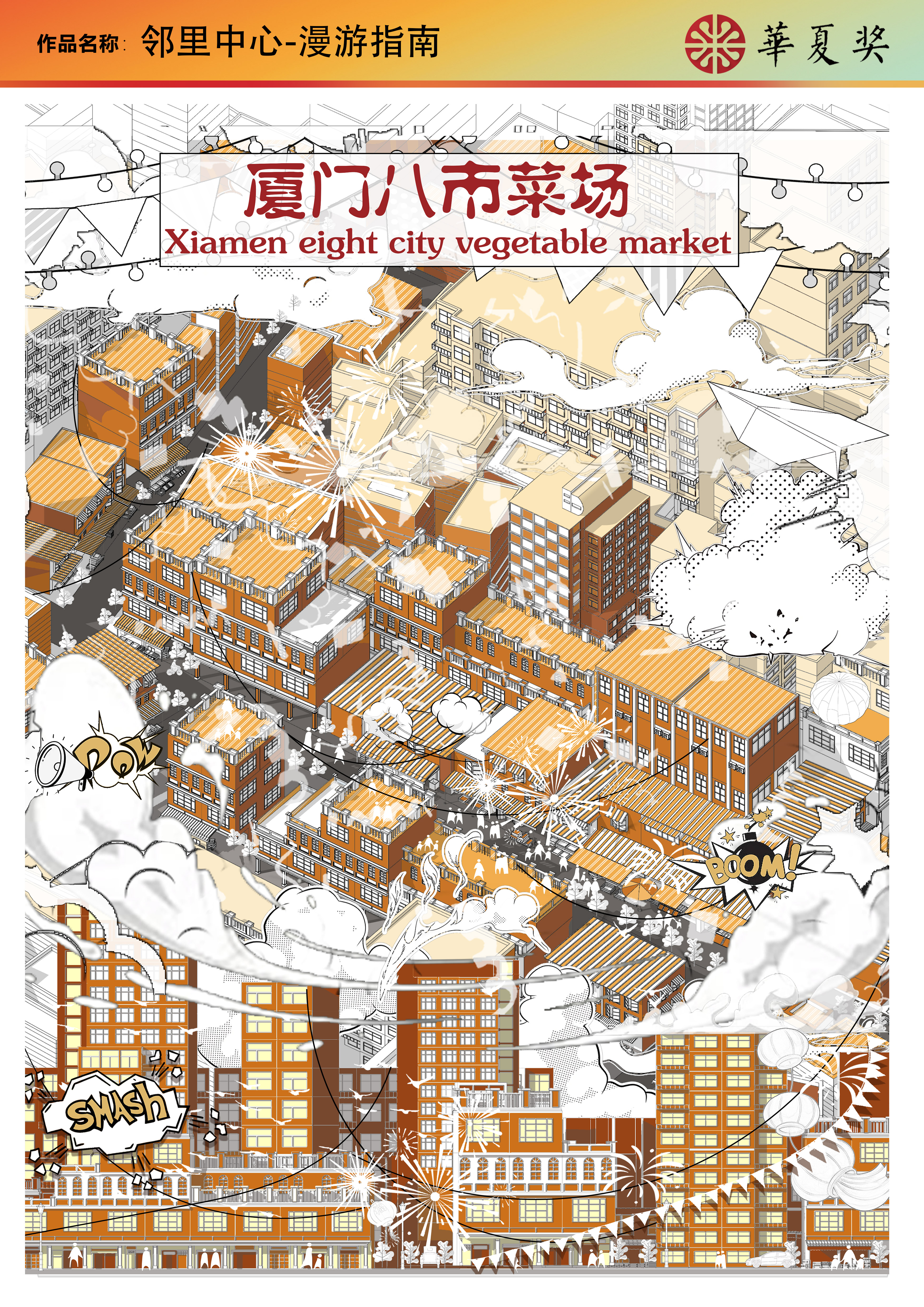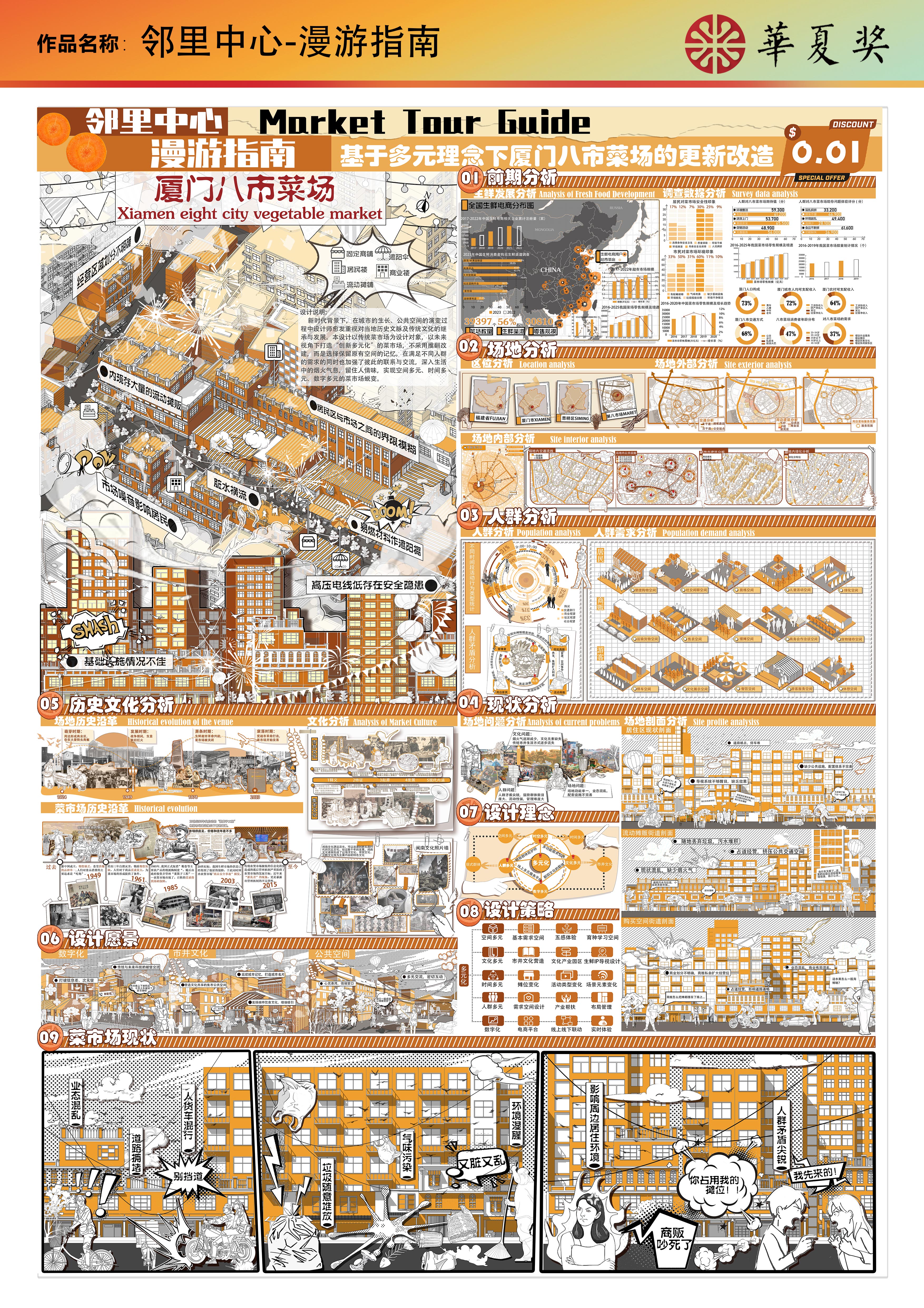 作品简介:新时代背景下,在城市的生长、公共空间的演变过程中设计师愈发重视对当地历史文脉及传统文化的继承与发展。本设计以传统菜市场为设计对象,以未来视角下打造“创新多元化”的菜市场,不采用推翻改建,而是选择保留原有空间的记忆,在满足不同人群的需求的同时也加强了彼此的联系与交流,深入生活中的烟火气息,留住人情味,实现空间多元、时间多元、数字多元的菜市场蜕变。
