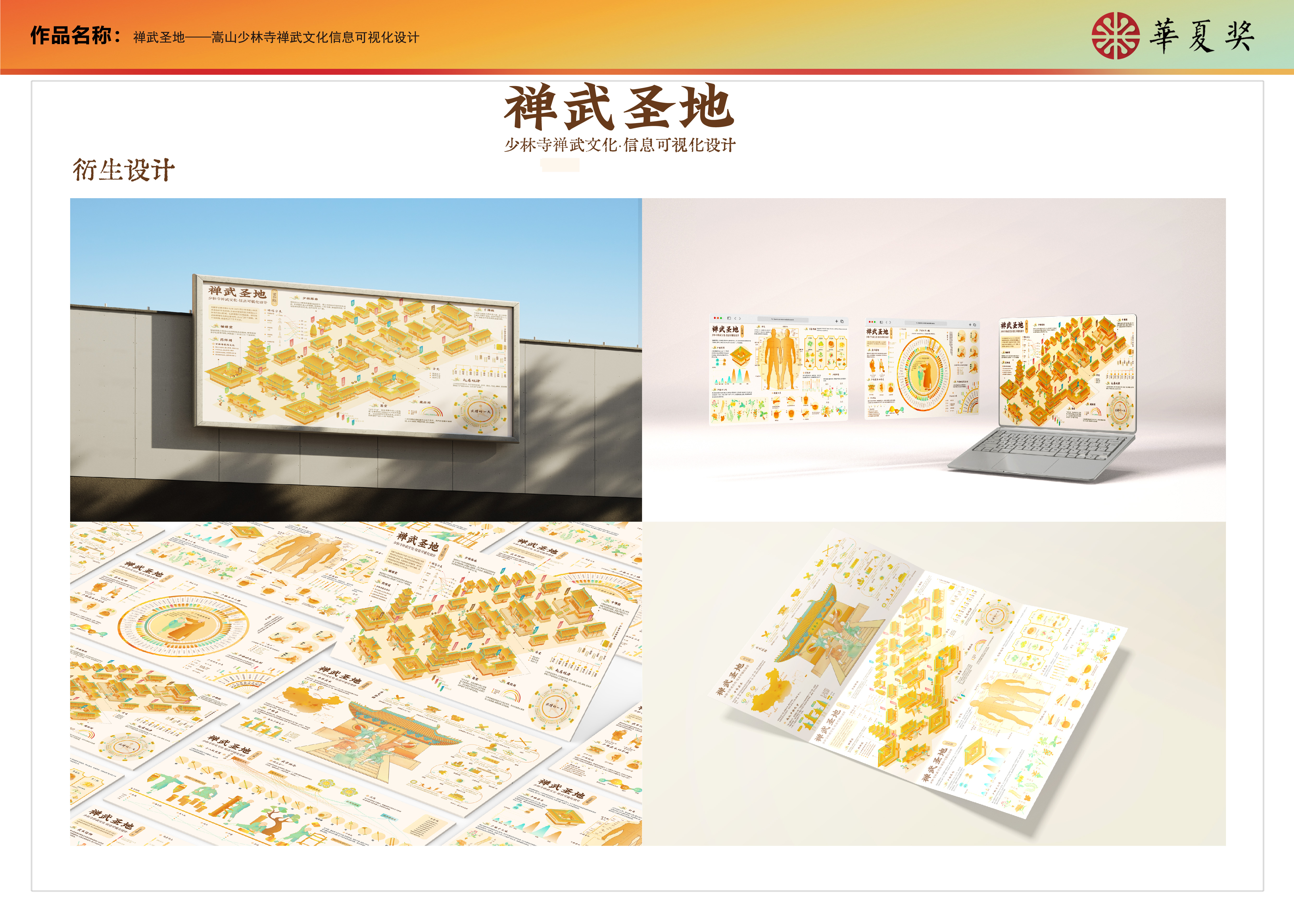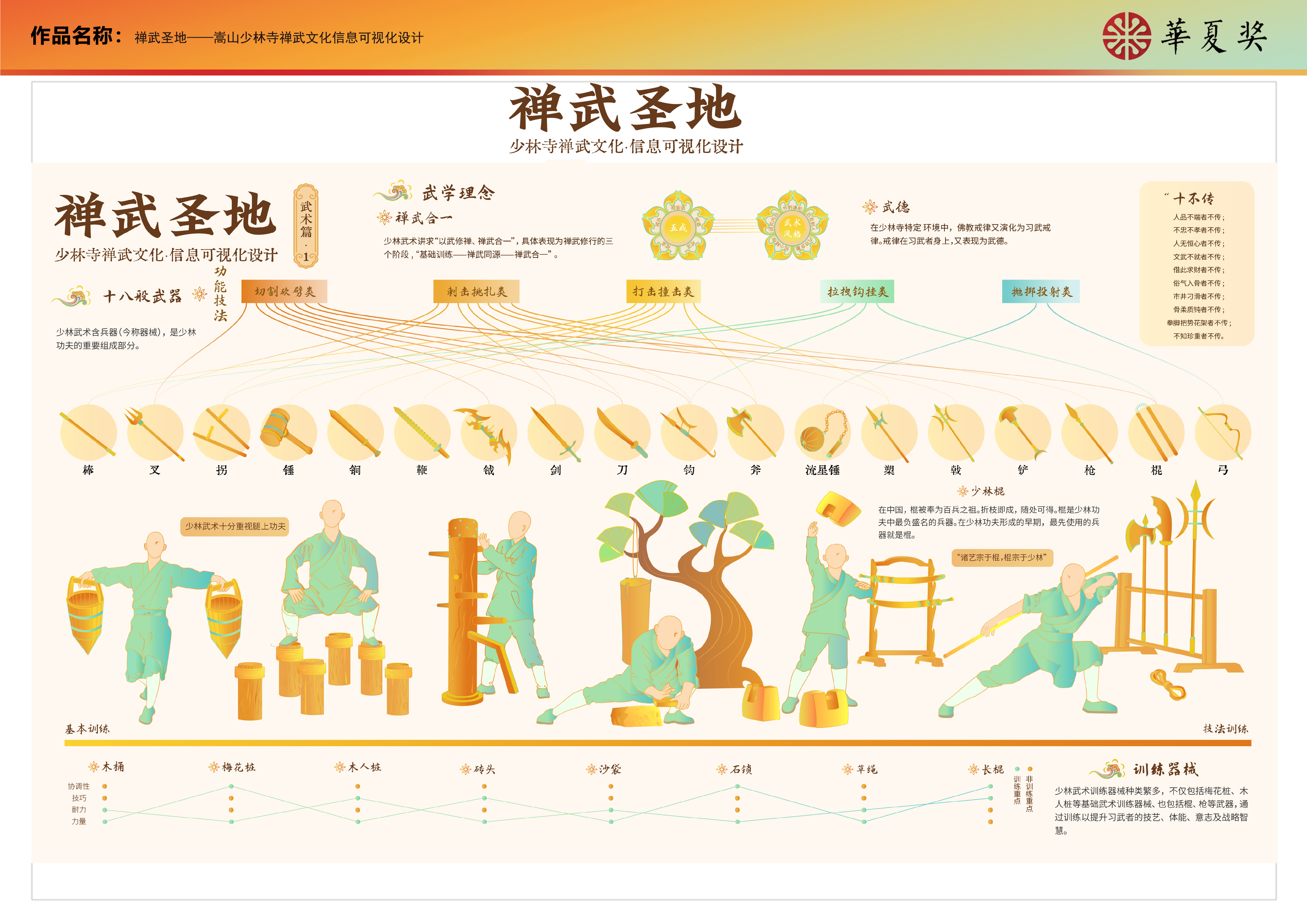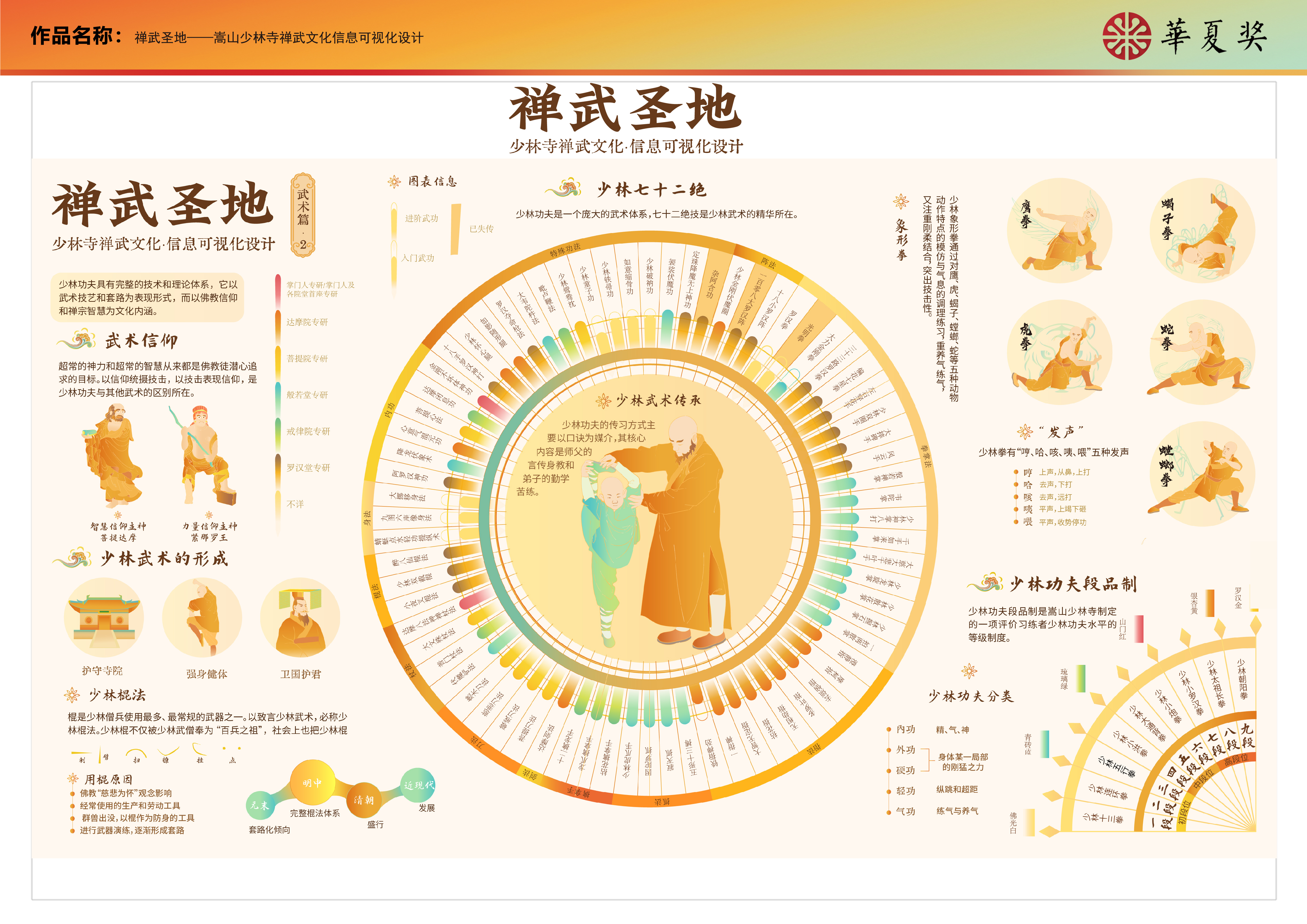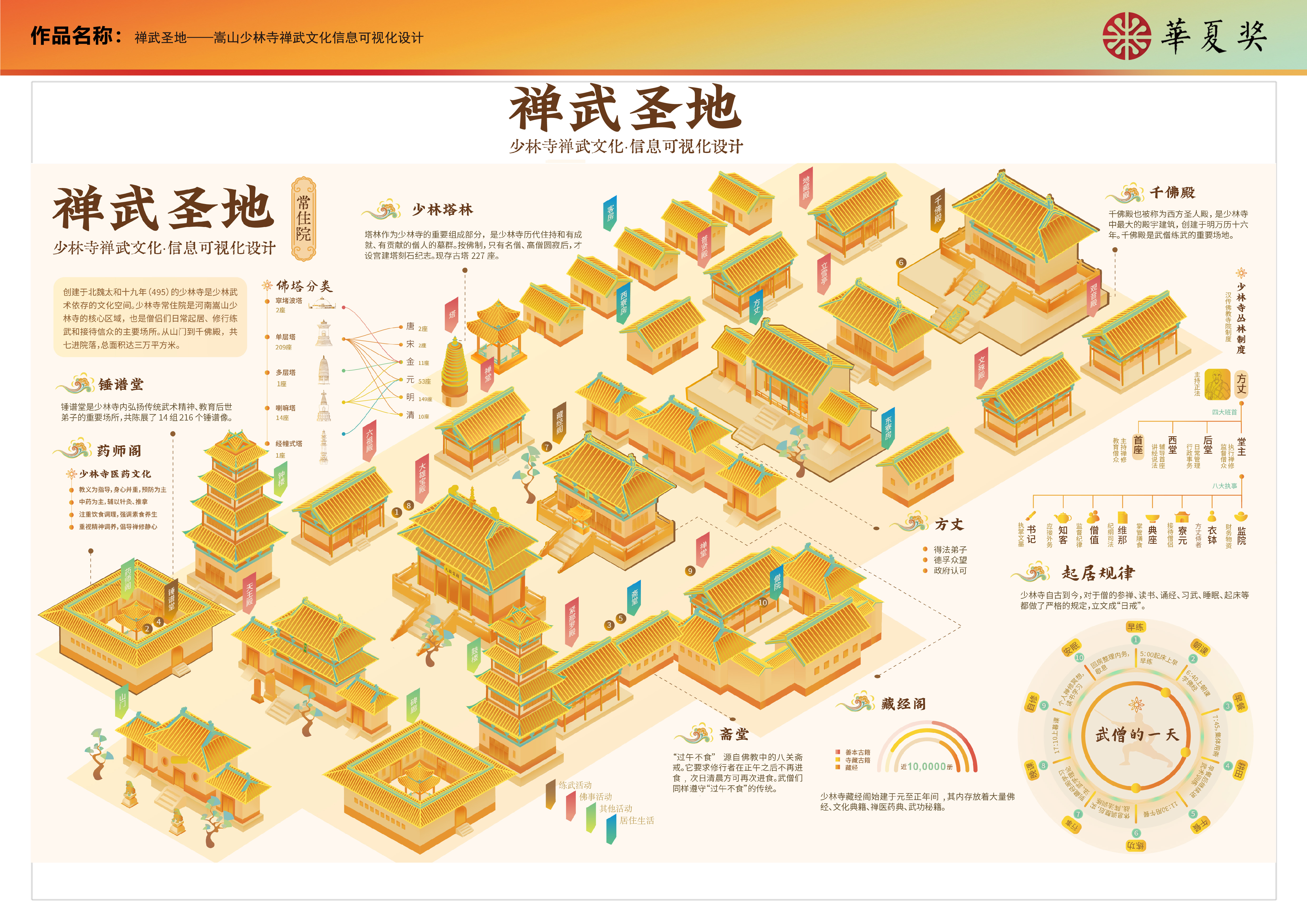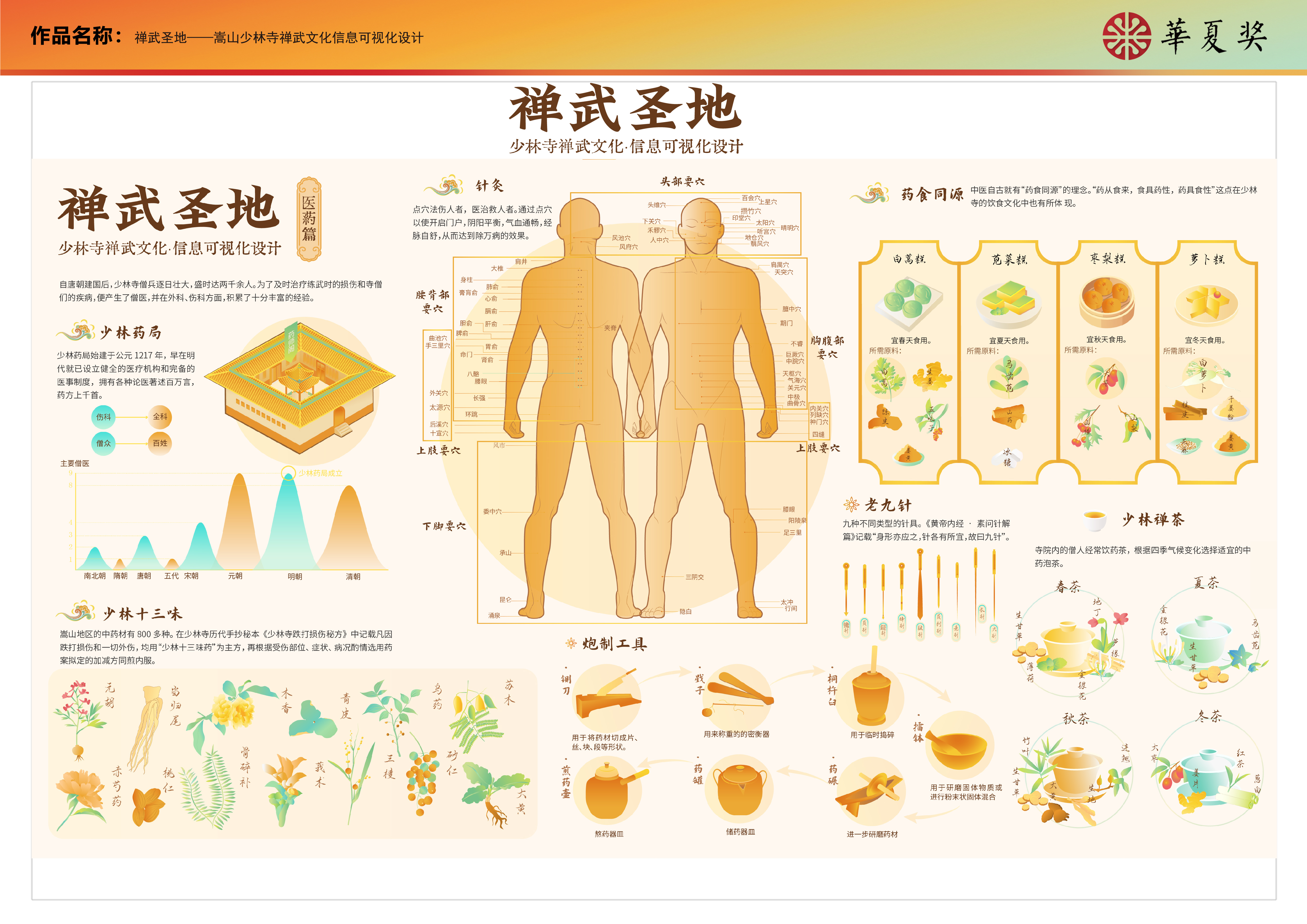 “深山藏古寺,碧溪锁少林。”少林寺自古便以禅医武文明于世。本设计分别从概述篇、常住院、武术篇、医药篇等四个方面对少林禅、武、医文化进行了信息可视化设计,旨在使更多的人了解少林寺的禅武文化。