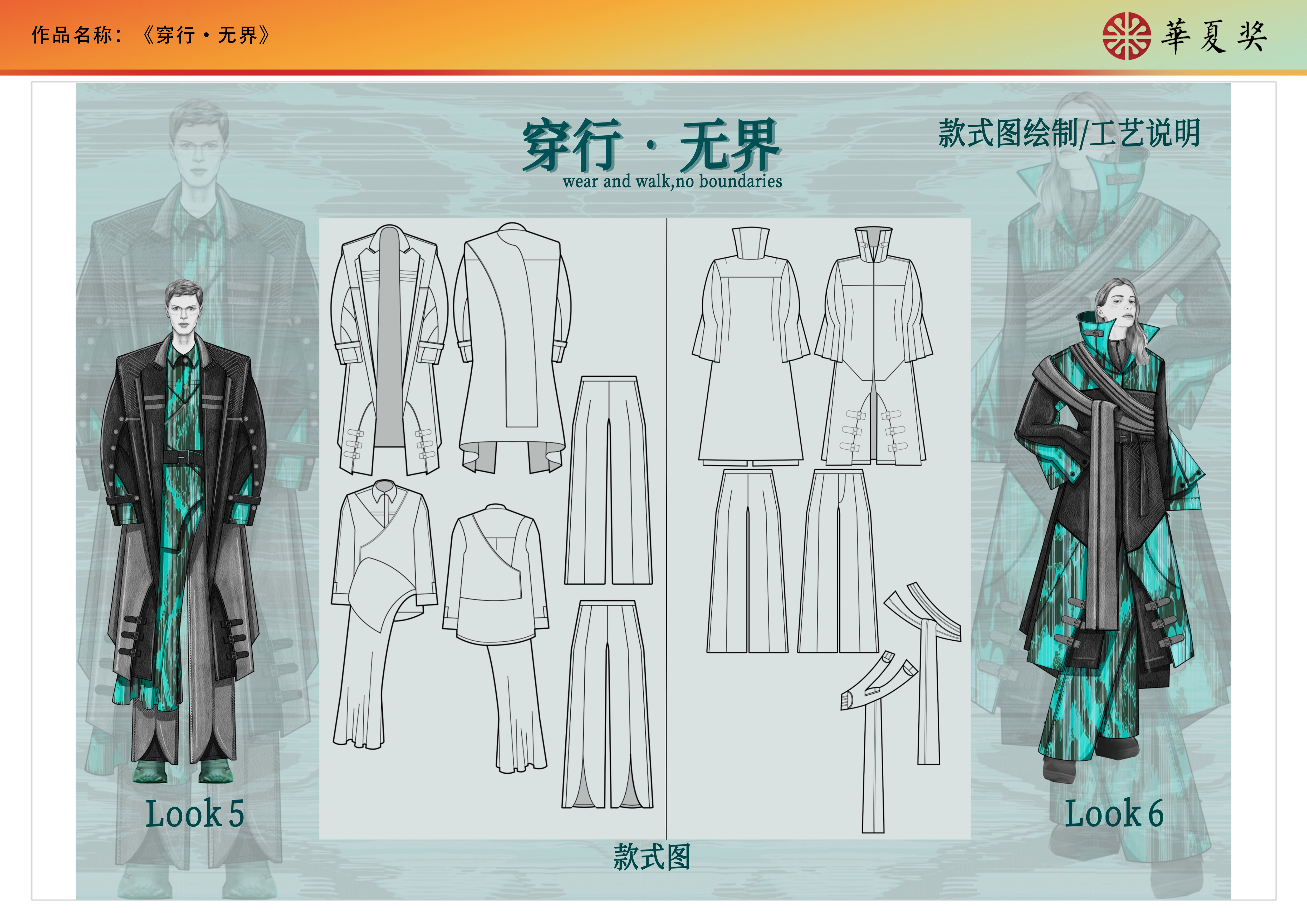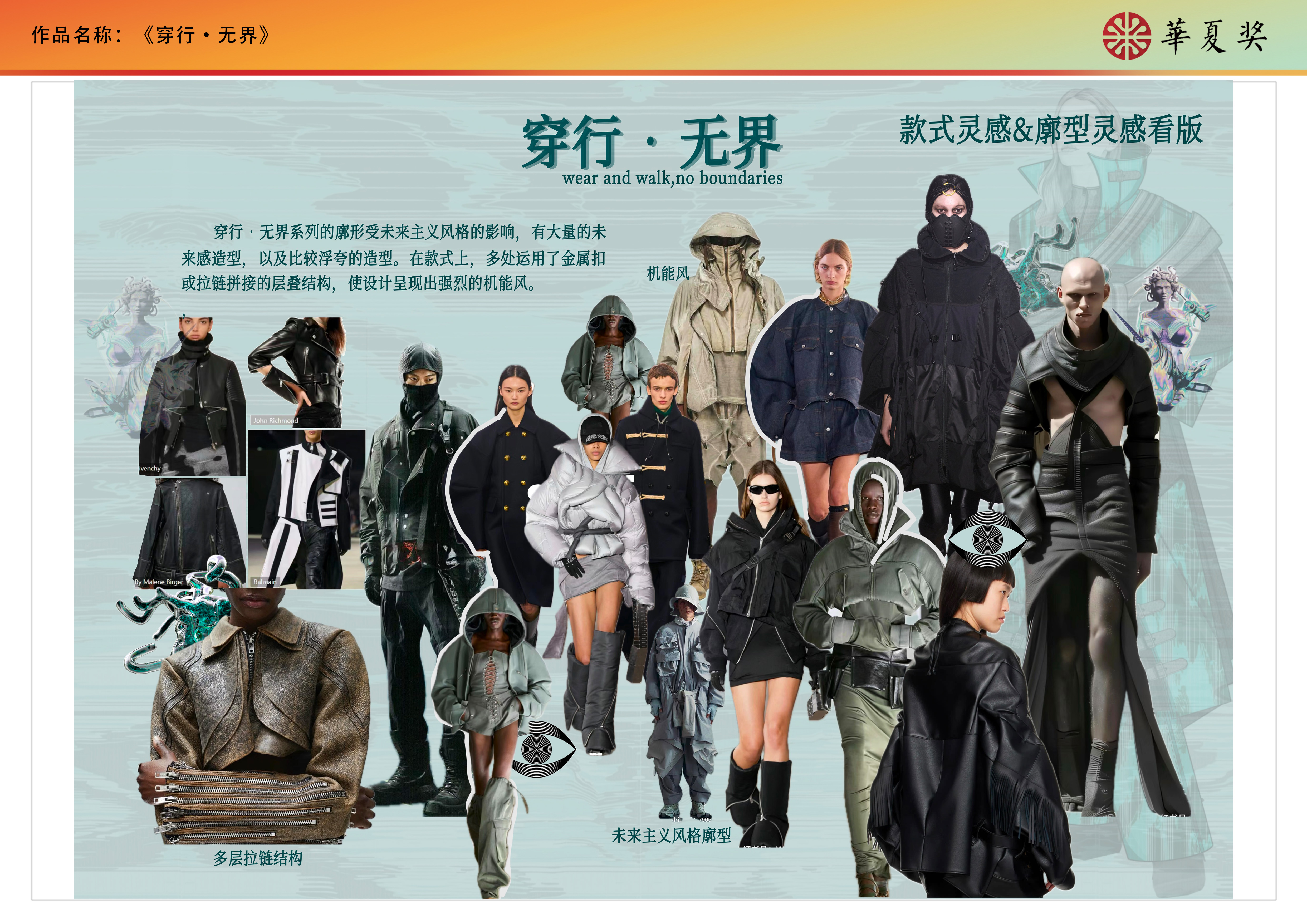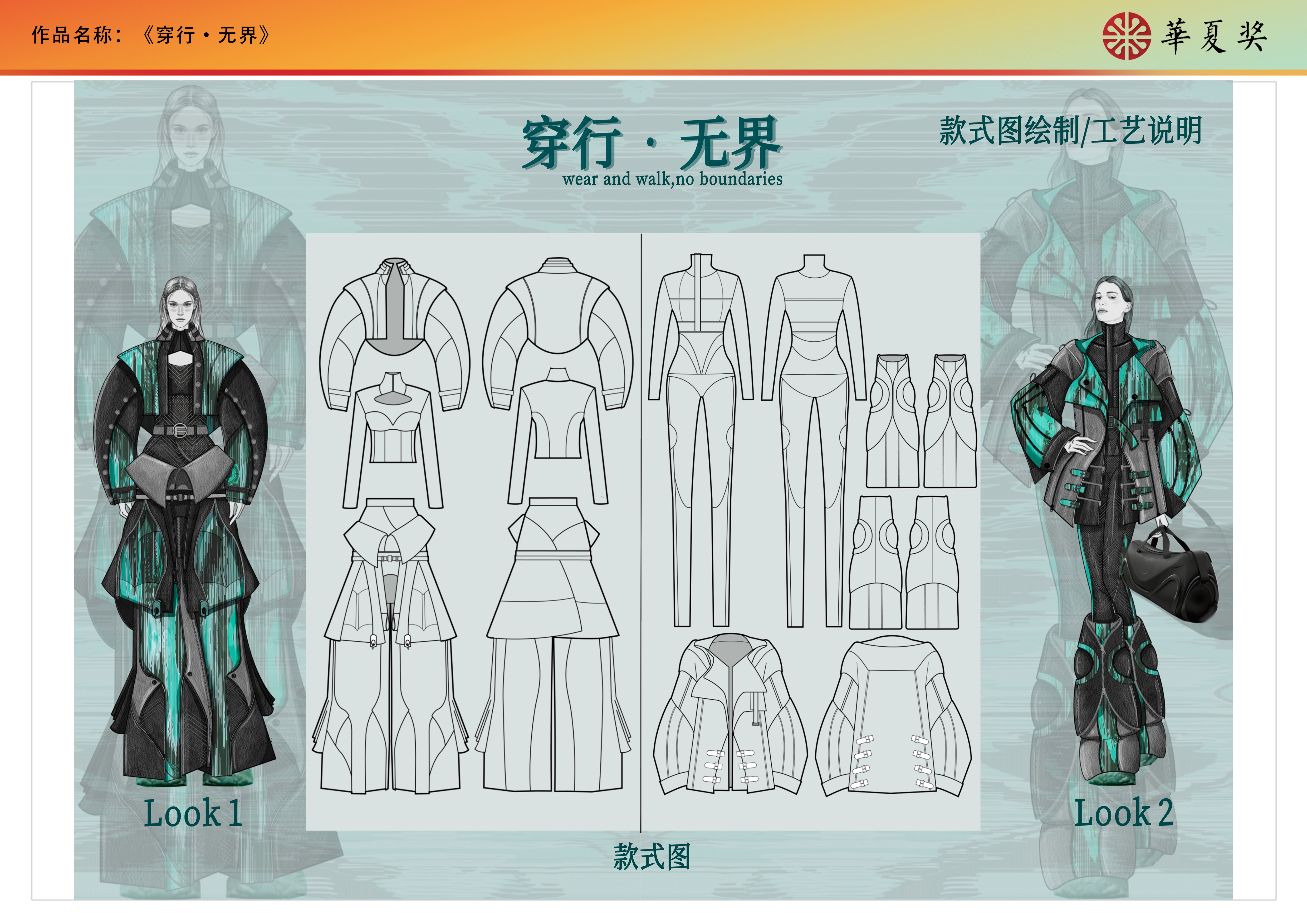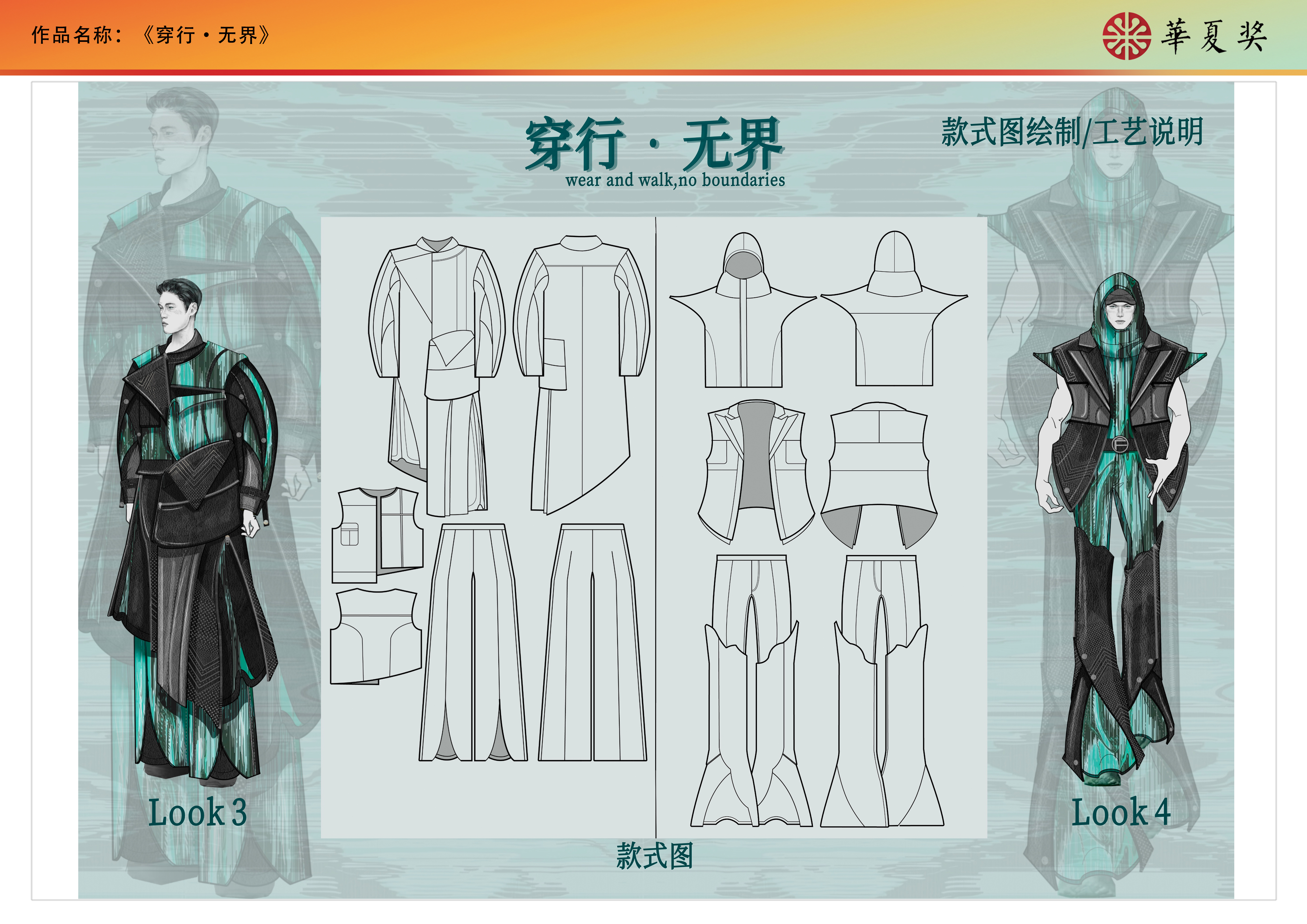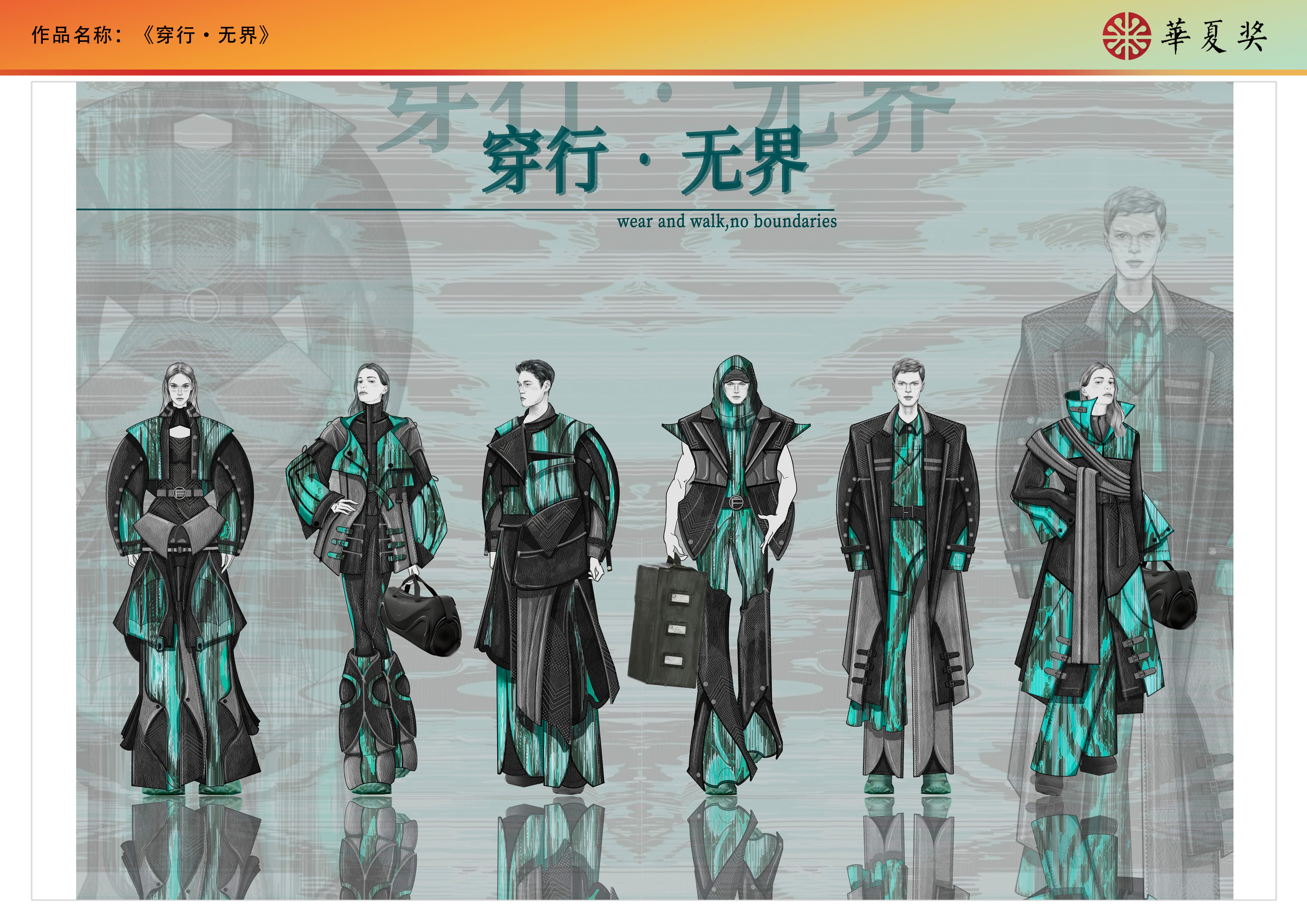 《穿行•无界》系列灵感来自于未来文明与自然景观,旨在表达未来人与自然的和谐共处。本系列设计将未来主义与原始元素巧妙结合,展现了自然与科技交融的审美观念。廓形受未来主义风格的影响,呈现比较浮夸的造型。色彩以黑色和灰色为主,加入高饱和度青绿色图案。面料是牛皮和可再生聚酯纤维,在此之上应用了光感印花图案,灵感源于变色龙因环境光变化而变色的这一行为。印花图案灵感来自于自然景观,此外在皮衣上运用了镂空工艺。